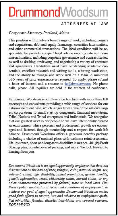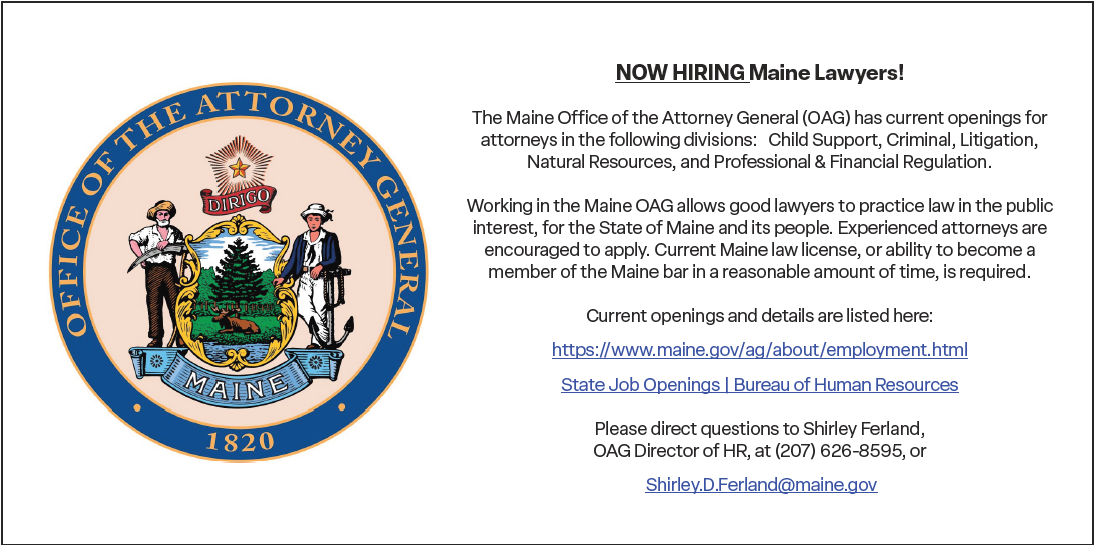 - Upcoming Event: Maine Lawyers for the Rule of Law – Public Forum on Standing up for the Rule of Law: How do we save it? Tuesday, October 14, 7 pm, at Hannaford Hall in Portland; Keynote Speaker Noah Feldman